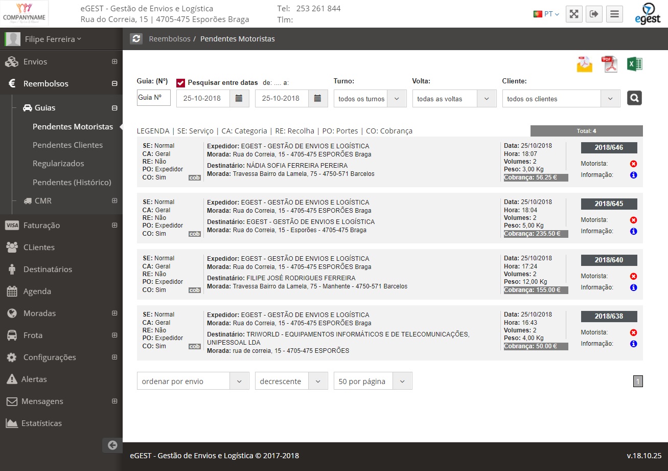 Com o eGEST poderá fácilmente gerir todos os envios, recolhas, reembolsos e custos de cada envio.